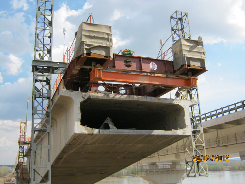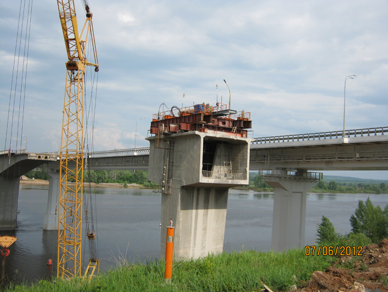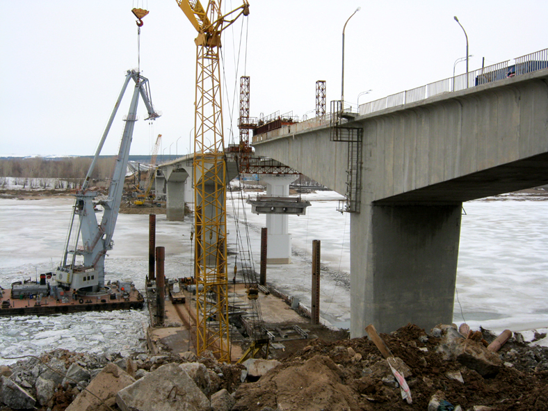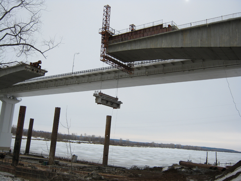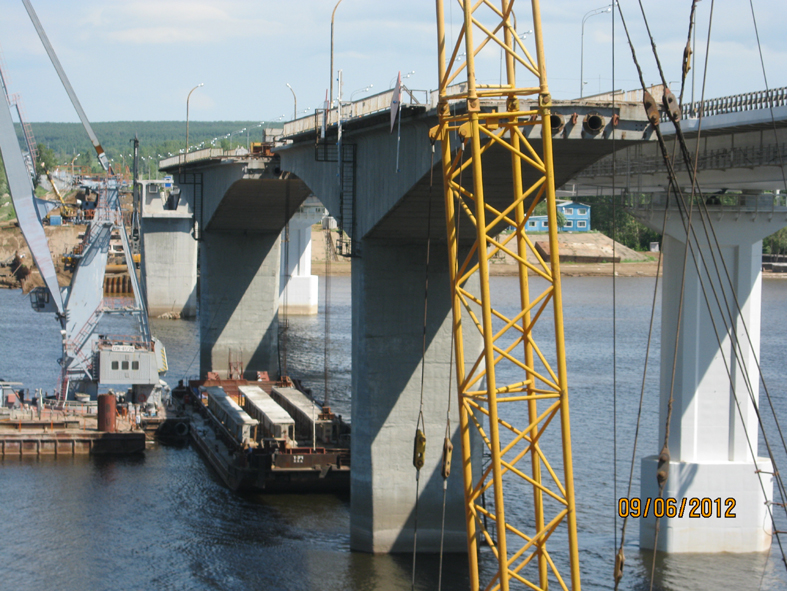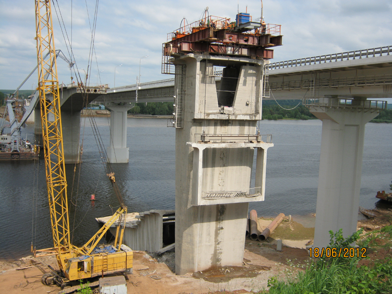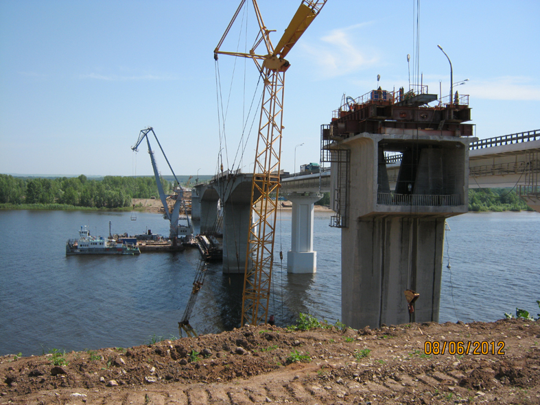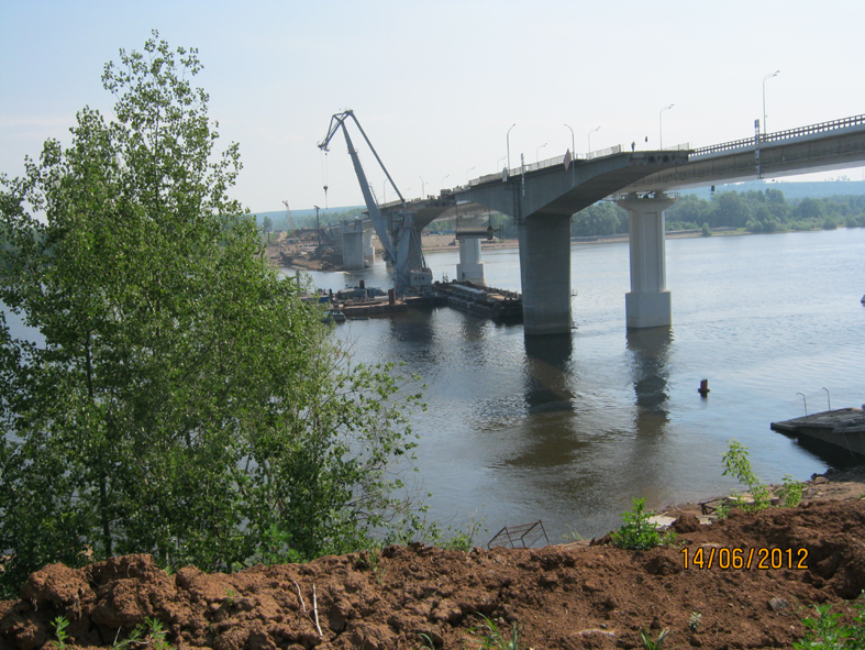 Описание: Реконструкция мостового перехода через р. Вятка. Республика Татарствн. Разборка железобетонного рамного моста. Разработка механизмов для разборки. Производство работ.